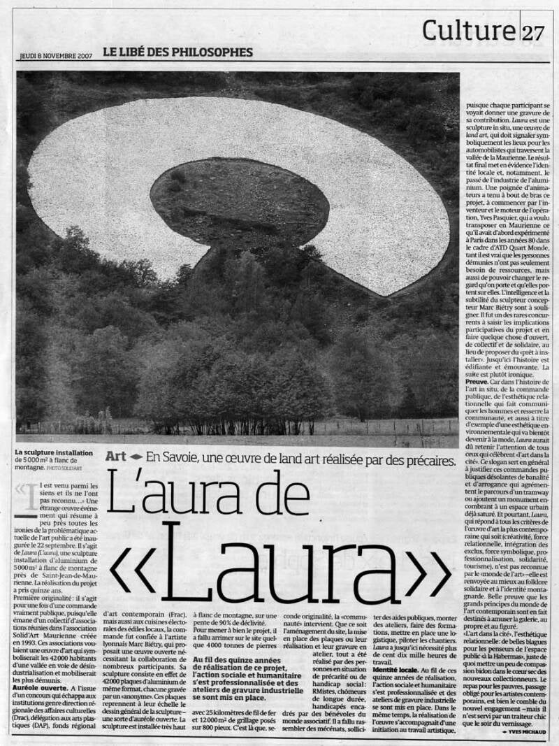 L’Aura, ou Laura ? Le 22 septembre 2007, était inaugurée “L’Aura de Maurienne” (dénomination qui s’est imposée au fil du temps), mais Laura de Maurienne était le nom choisi initialement par l’artiste Marc Biétry. « C’était l’aboutissement de treize années de travail conduites par Solid’art Maurienne, avec l’objectif de favoriser le lien social à travers un projet utopique et solidaire », rappelle Bernard Ratel, président des Ateliers de Maurienne ; « pour nombre de Mauriennais, sa vision fait surgir des souvenirs d’une démarche hors norme, de beaux moments partagés, d’une inauguration grandiose ».